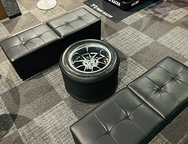 休憩スペースにはおしゃれなソファや、車のホイールを使ったテーブルなど、遊び心のあるインテリアを配置。